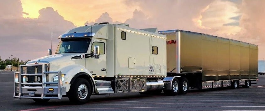 Transmission is a 13-spd Eaton Fuller UltraShift Automatic; 344” WB, Tires: 365 70R 22.5. 11R 24.5; 300-gal fuel capacity, weight 26,638 lbs.; Herd Defender Grill Guard Bumper; Torque 1850; Front axle rated at 16,500; Rear axles rated at 40,000; Gear Ratio is 3.25
