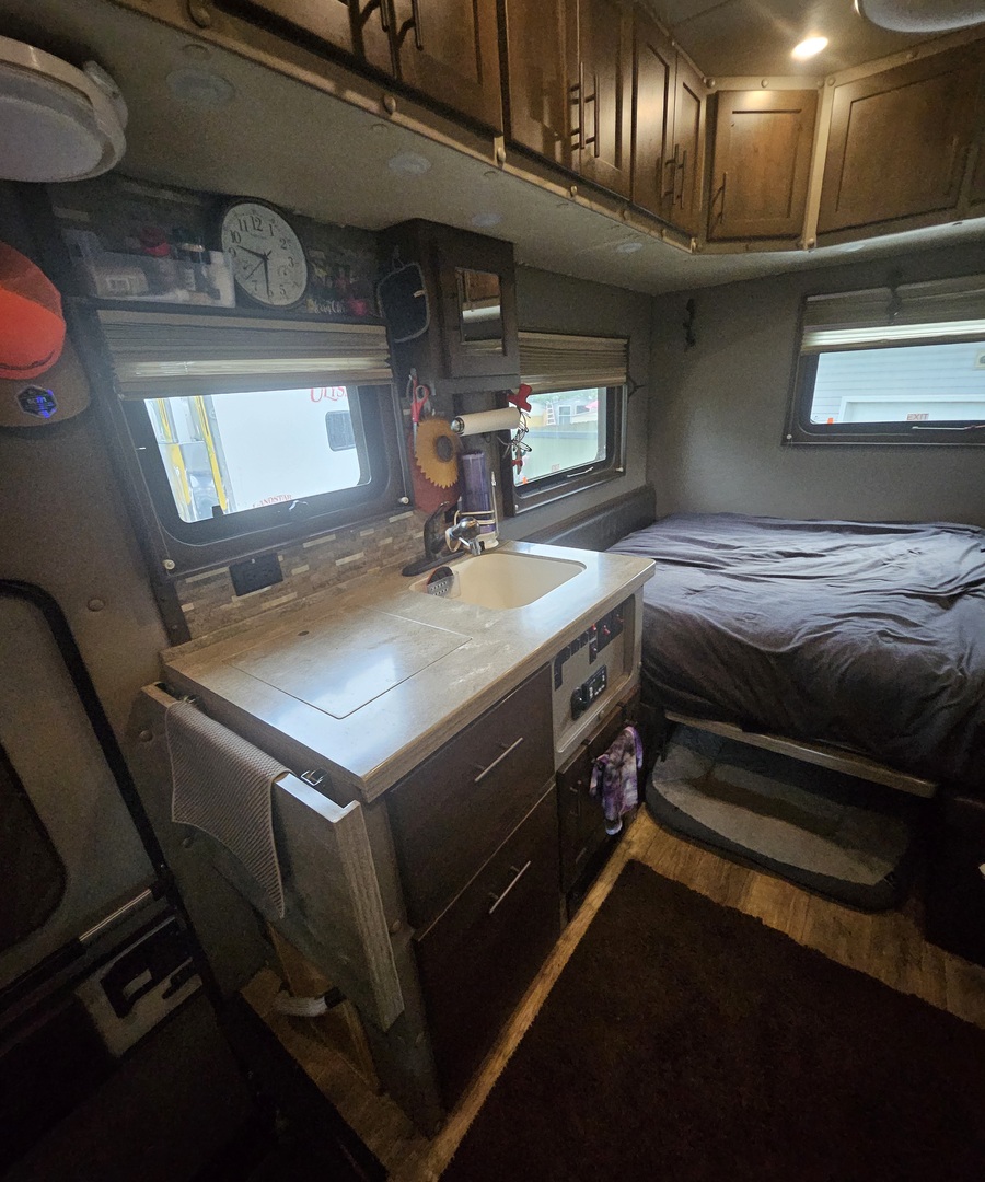 300-Gal fuel capacity, Onan Quiet Diesel 7500 Watts 3 cyl. with 3,560 Gen Hours, 35-gal. water capacity, Weight – 29,500 lbs. full of fuel and water and all our gear.